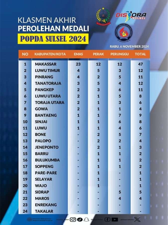 Dengan perolehan ini, total medali yang diraih Kabupaten Luwu adalah 1 Emas, 1 Perak, dan 4 Perunggu, menjadikan Kabupaten Luwu menduduki peringkat ke-11 di Pekan Olahraga Pelajar Daerah Sulawesi Selatan 2024. Prestasi ini patut disyukuri sebagai hasil kerja keras, dan menjadi motivasi untuk perbaikan ke depannya.